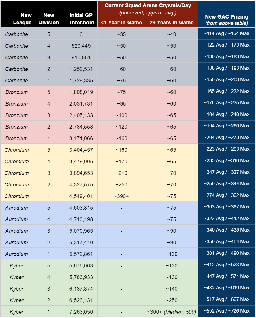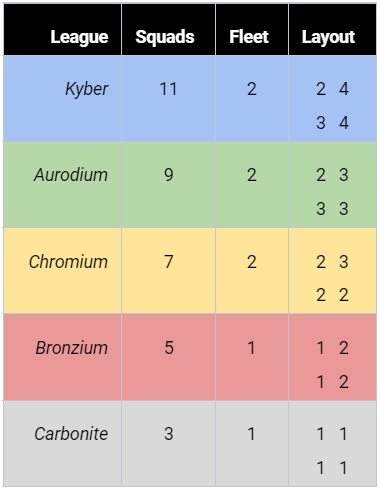 グランド・アリーナでは、スキルレーティングに基づいたより伝統的なラダーシステムが採用されます。つまり、グランドアリーナでの昇格はGPから切り離され、シーズンごとに頂点を目指すのではなく、時間をかけて梯子を登っていくことになります。各シーズンは4週間ですが、リーグ間の移動はシーズン終了時のみとなり、ディビジョンの変更は各イベント終了後に行われます。 新しいGACに参加すると、プレイヤーは銀河系のパワーに応じたスキルレーティングが与えられます。リーグやディビジョンの最初のシードは、このスキルレーティングに基づいて行われます。それ以降のスキルレーティングは、GAC中の勝敗によってのみ更新されます。 スキルレーティングは各イベント後に調整され、スキルレーティングに基づいて対戦相手が決定されます。ディビジョン1(リーグの上位10%)でシーズンを終えたプレイヤーは、次のリーグに昇格し、リーグのディビジョン5(下位10%)のプレイヤーは降格します。(注:自分のリーグ以外のプレイヤーと対戦することはありません)。 この変更の目的は、すべてのプレイヤーがより適切な相手と競い合い、より良い対戦を実現するとともに、サンドバッグ行為や参加しないことへのインセンティブを減らすことにあります。この新しいマッチメイキングシステムは、イベントを1、2回こなした後には、あなたのスキルがより正確に反映されるようになりますが、最終的には、カイバー・リーグは、自分の部隊を最大限に活用しているゲーム内の最高のプレイヤーを代表するものでなければなりません。 注:ディビジョンとリーグの呼称が入れ替わりました。リーグはディビジョンと呼ばれ、ディビジョンはリーグと呼ばれるようになりました。これは、他の一般的なトーナメントシステムに沿ったものです。
