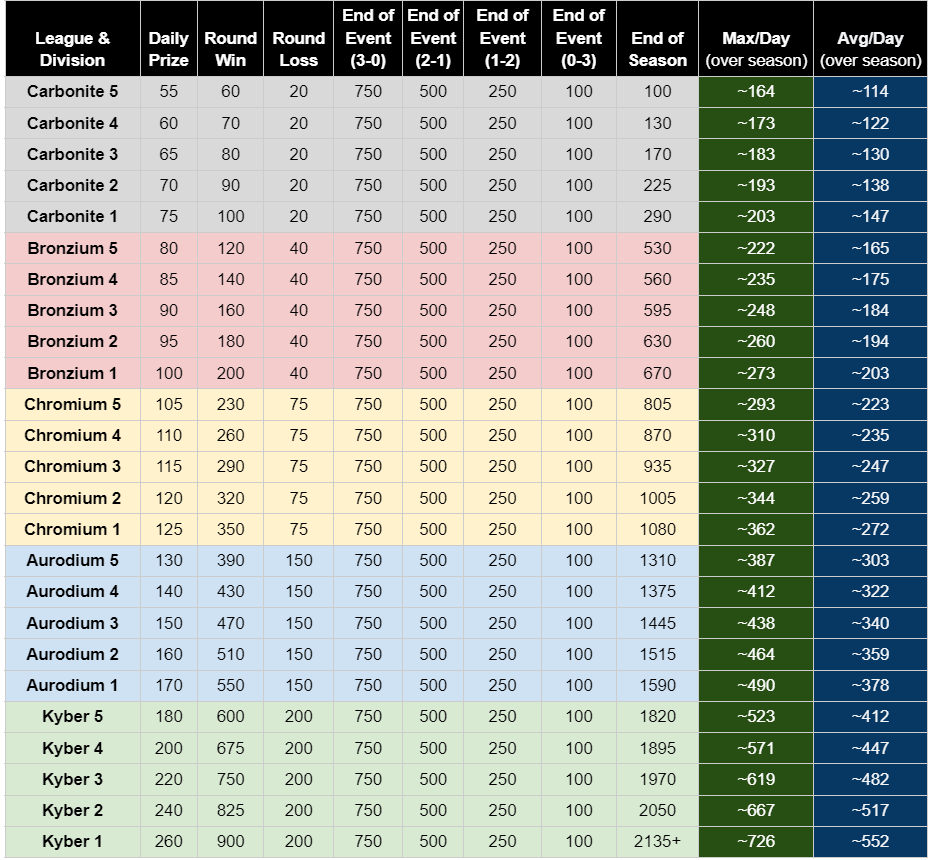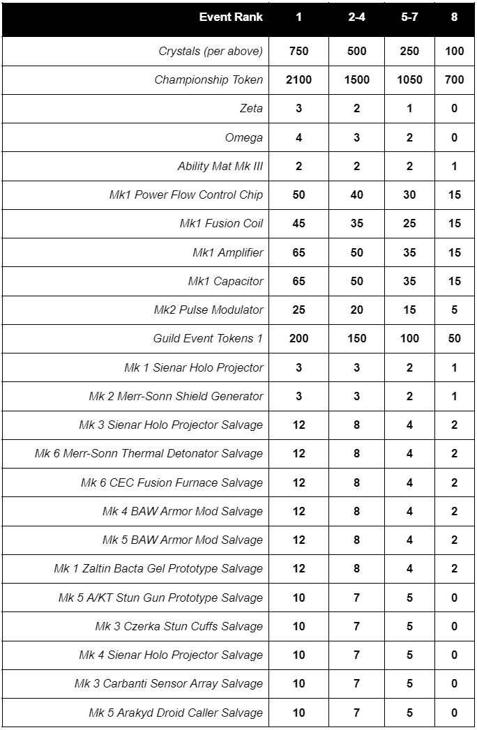 シーズン終了時の報酬は、リーグとディビジョンの変更、およびクリスタル賞の追加を反映して、フォーマットが更新されました。(注:一部の「チャンピオンシップトークン」は、様々な力を持つ3~0人のプレイヤーにより平等に報いるために、イベント賞に移動しました)。