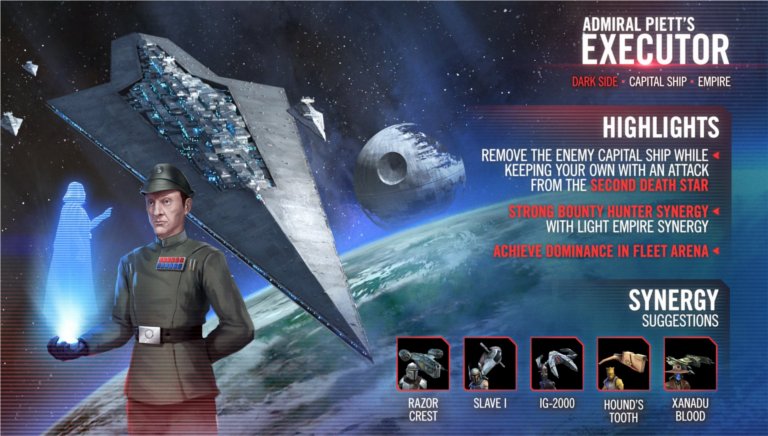 賞金稼ぎには、ホロテーブル上で戦いをリードする主力シップが用意されています。史上最大かつ最強の帝国軍艦の一つであるエグゼクターは、ホスの戦いとエンドアの戦いで帝国軍を先導した。ピエット提督の下、このスーパー・スター・デストロイヤーは敵の心に恐怖を与えた後、デス・スターに突入してその生涯を終えました。