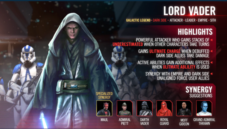 - 彼のチームはしばしば弱体を受けたり、強化を失ったりすることで利益を得ており、これは少し珍しいことですが、面白いゲーム戦略を生み出しています。弱体を受けたダークサイドの味方がダメージを受けるたびに、ベイダー卿はアルティメットチャージを得ます。ダークサイドの味方が強化を失うたびに、エンパイアとダークサイドの非同盟のフォースの使い手の味方はマスターを得る。ピエットは相性が良さそうですね。