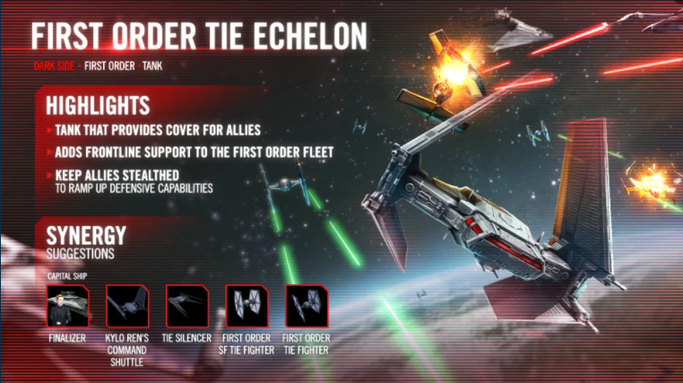 - これにより、プレイヤーはこの艦隊から他のタンクを移動して、TIEエシュロンをファースト・オーダー艦隊の専用タンクとして機能させることができます。
