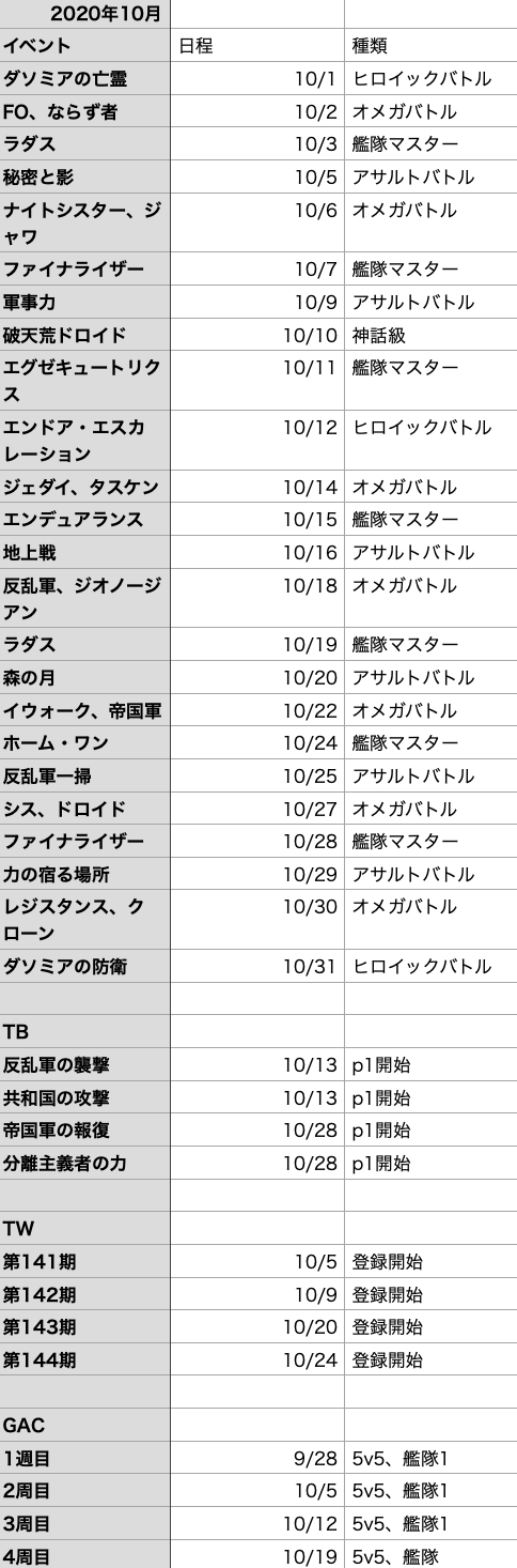 2020年10月のスケジュールです