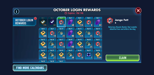銀河チャレンジ報酬 †今後、すべての銀河チャレンジにおいて、最大報酬以外の賞金箱が増加します。最大報酬額はほぼ変わりませんが、最大報酬額までの報酬額の上昇幅が小さくなることで、新米プレイヤーや中堅プレイヤーの報酬を高めることができます。 フェーズ1の今後の展開 †今週のタイトルアップデートでは、装備品変更のプロセスを開始しますが、まだ多くの調整を予定しています。フェーズ1では、ハードノード装備品のドロップ率の変更、テリトリーバトルの報酬の平均化、コアとなる装備品のみを提供するシャードショップの新しい専用スロットの追加などがあります。これらが完了したら、近い将来、フェーズ2の内容について話し始めます。 新機能 特別ログインカレンダー †今回のタイトルアップデートでは、ゲームにログインした際に毎日目にする「ログインカレンダー」が変更されます。ログインカレンダーのUIが刷新され、追加のカレンダーを有効にすることで、毎日の報酬を追加することができるようになりました。これらのログインカレンダーは、無料または有料で、特別な日や月ごとのテーマに合わせて提供されます。 現在のログインカレンダーと同様に、開始日に関係なく最初から報酬を集めることができますが、有効期限までにすべての報酬を集める必要があります。ログインカレンダーの中には、すべての報酬を受け取るまでの期間が短いもの(月間ログインカレンダーのようなもの)と、より柔軟なものがあります。一度に複数のカレンダーを有効にして、毎日各カレンダーから報酬を受け取ることができます。 報酬を受け取るためには、毎日のログインをお忘れなく。 モード専用のキャラクターとスキル †