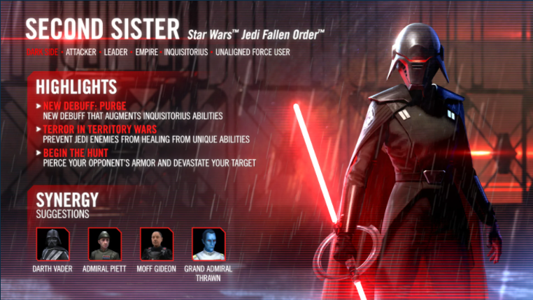 本日のアップデートでは、尋問官の最初のキャラクターであるセカンド・シスターが銀河の英雄に登場します! また、カイル・カターンのかけらに関するいくつかの情報、オミクロンの新しいキャラクター能力の更新、いくつかの修正も含まれています。