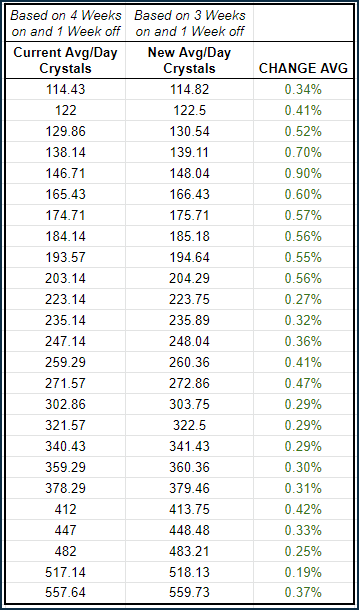 6月以降のグランドアリーナチャンピオンシップは、4週連続の開催から3週連続の開催に変更されます。グランドアリーナチャンピオンシップの報酬も、5週間サイクルから4週間サイクルになるため、この異なるスケジュールを補うように調整されます。(例:28日/4x7日サイクル vs 35日/5x7日サイクル). 例として、グラウンドアリーナチャンピオンシップの1日あたりの平均獲得クリスタルを比較します。 1日に獲得できるクリスタルの平均量はごくわずかに増加していますが、最も重要なことは、プレイヤーが平均して獲得できるクリスタルが少なくなることはない、ということです。また、全体的なスケジュールが短くなることで、週休二日制がより頻繁に行われるようになりますが、イベント終了時の報酬もより頻繁に行われるようになります。そのため、報酬のバランスを取り、上の表を実現するために、いくつかの変更を行います。